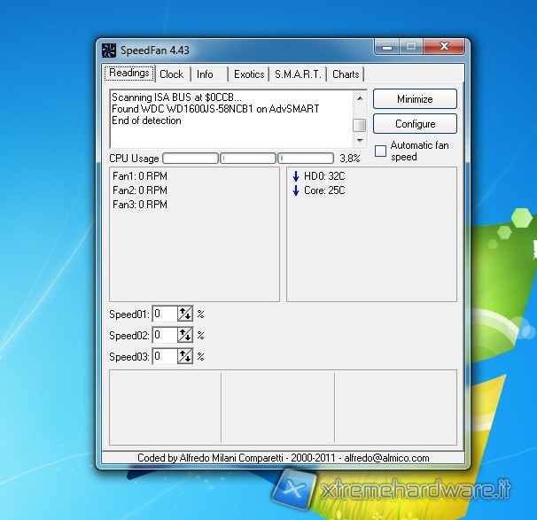 Passiamo adesso all'analisi delle temperature rilevate sulla CPU, sia in stato di riposo (idle), sia in stato di massimo carico operativo (full load). A tal proposito abbiamo usato per mettere sotto stress la CPU, che nel nostro caso è il modello triple core AMD Athlon II 450, l'ottimo software di stress testPrime95 vers. 26.11. Abbiamo fatto le letture delle temperature rilevate tramite l'utilizzo del software SpeedFan nella versione 4.43. Rileviamo qui come, in condizione di riposo, i valori di temperatura rilevati siano eccezionalmente bassi, merito dell'efficacia del sistema di dissipazione e dei sistemi di risparmio energetico della nostra CPU, attivi in idle.