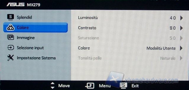 Accedendo al menù OSD si arriva inizialmente alla funzionalità Splendid dove si potrà selezionare una delle modalità di visione. Nel secondo tab, Colore, si potrà agire sui parametri quali la luminosità, il contrasto e il colore, che permette a sua volta le opzioni Freddo, Normale, Caldo e Utente, per una regolazione personalizzata.